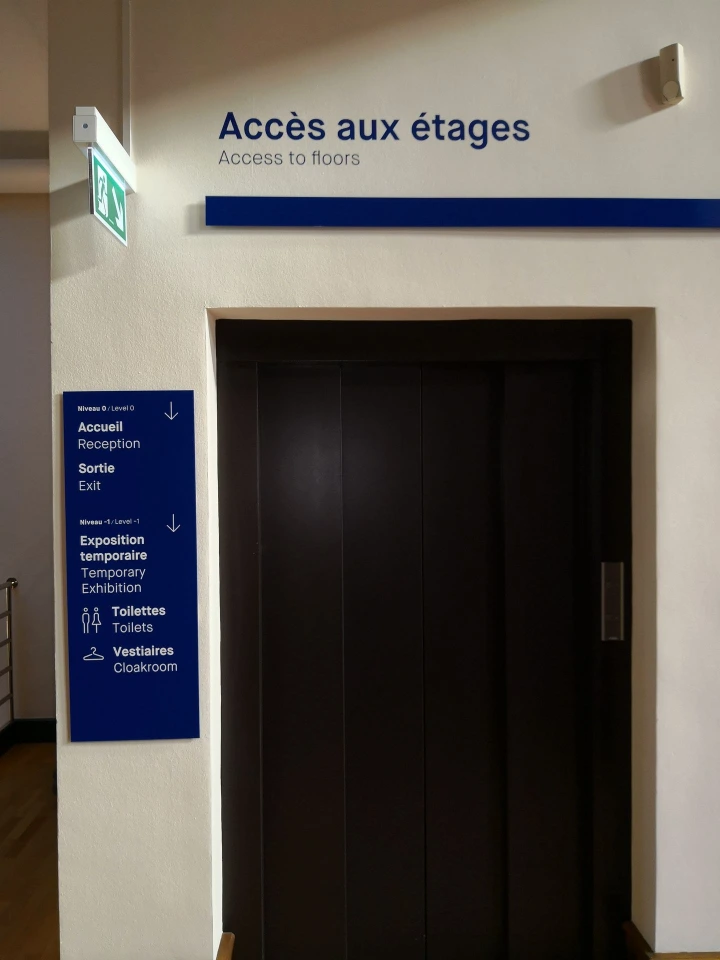 Mon rôle : concevoir, fabriquer et installer l'ensemble de la signalétique du musée — pièce par pièce, salle par salle — en respectant les contraintes strictes du bâtiment classé.