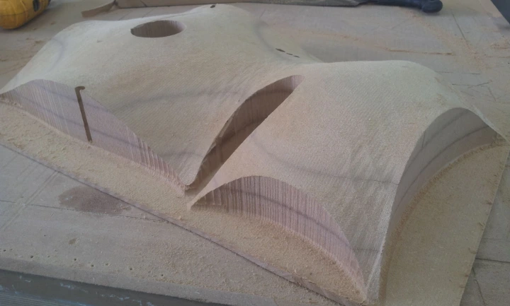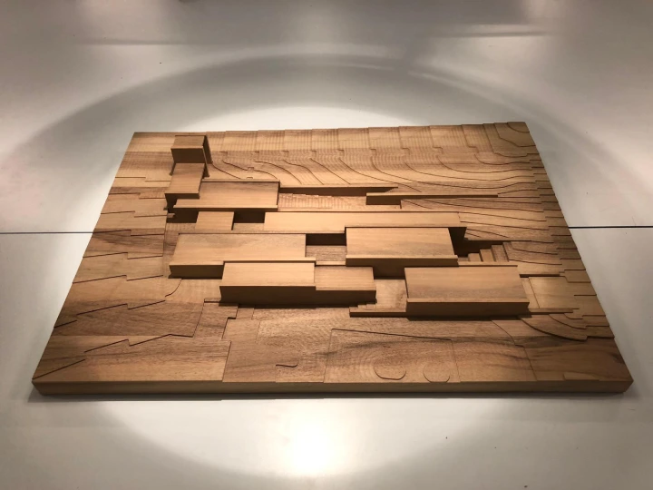 - Fraisage CNC 3 axes (2.5D) pour maquettes en bois : volume des bâtiments et relief topographique usinés dans du bois massif